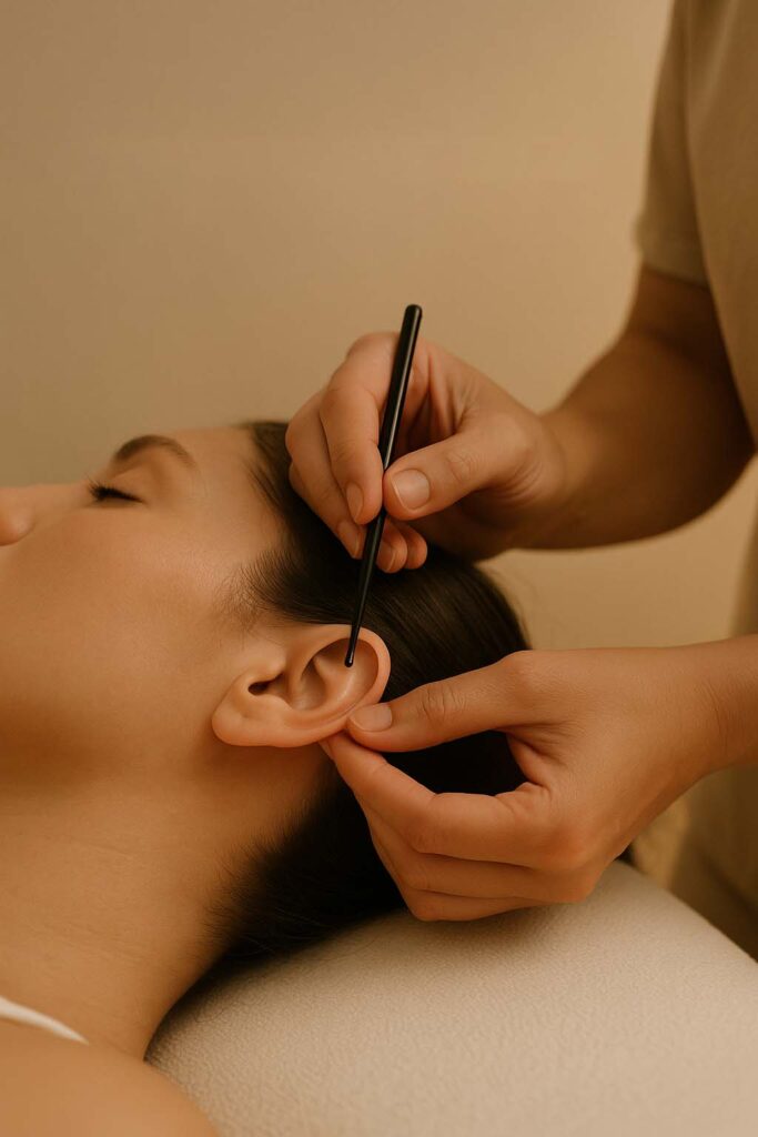 Tratamento através de pontos energéticos na orelha, com benefícios físicos e emocionais.