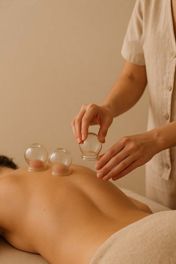 Aplicação de ventosas para aliviar dores, melhorar a circulação e eliminar toxinas.